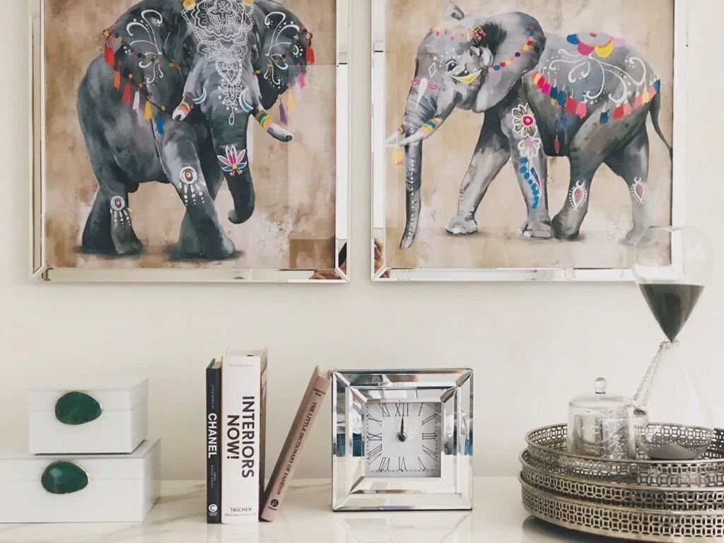 Detalle del producto: Cuadro con marco espejado y gráficas de elefante.